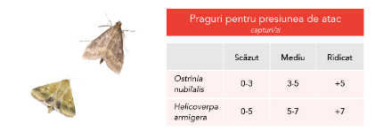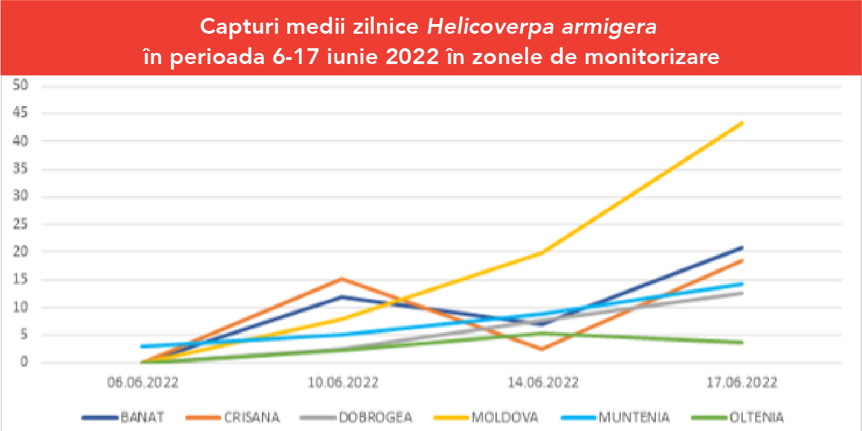 ATENTIE! S-a inregistrat zborul maxim al adultilor de Helicoverpa armigera, din prima generatie, in zonele Banat, Crisana, Dobrogea, Muntenia si Oltenia, iar in zona Moldovei capturile sunt in continua crestere. Helicoverpa armigera nu constituie un pericol direct pentru culturile de porumb in aceasta fenofaza, inainte de formarea stiuletilor, dar este recomandat tratamentul insecticid pentru controlul acesteia, deoarece necombaterea primei generatii a daunatorului determina o presiune mai puternica a generatiei a II-a a daunatorului. Generatia a II-a de Helicoverpa armigera apare de regula in momentul formarii stiuletilor (matasit – boabe ceara) si provoaca cele mai importante pagube la porumb, dar poate ataca si alte culturi de camp precum floarea-soarelui, aflata la inflorit si soia la formarea pastailor.