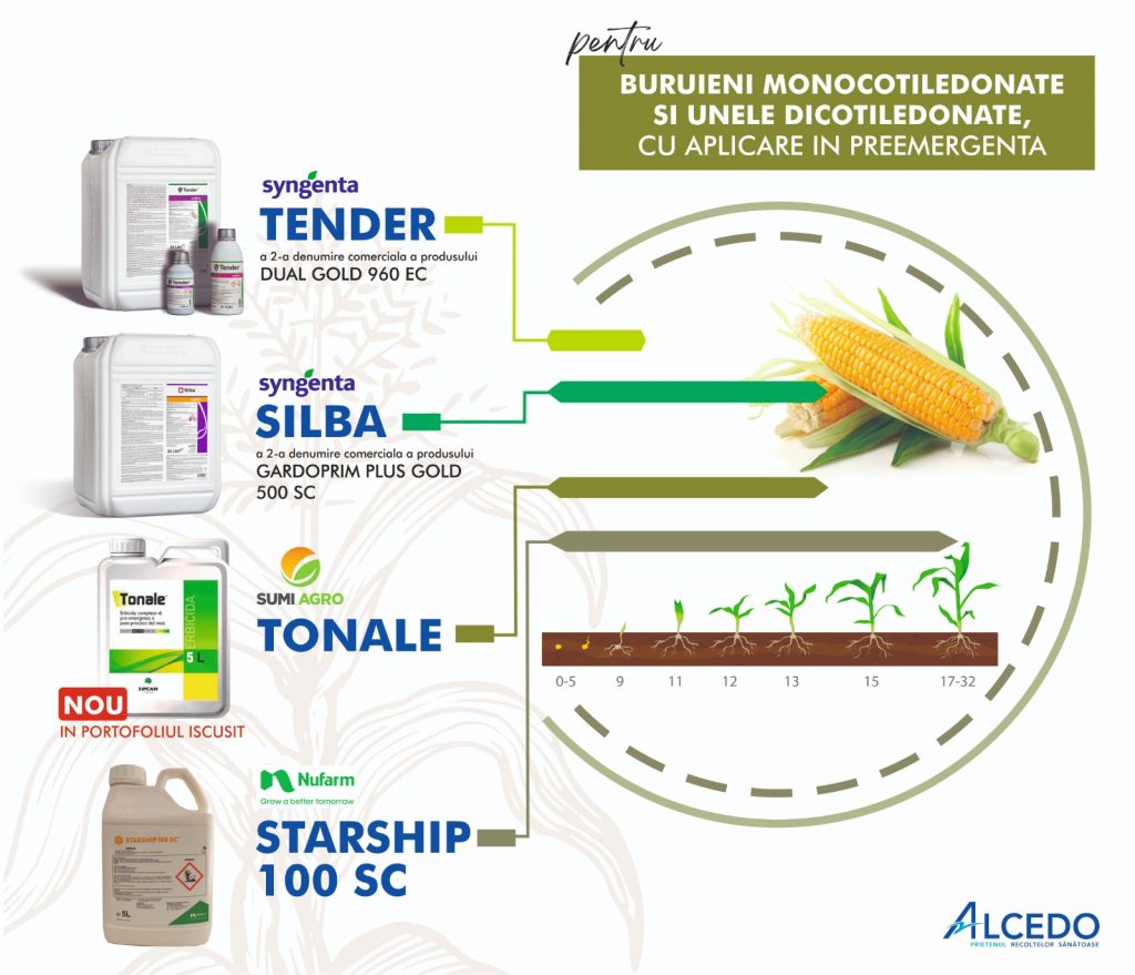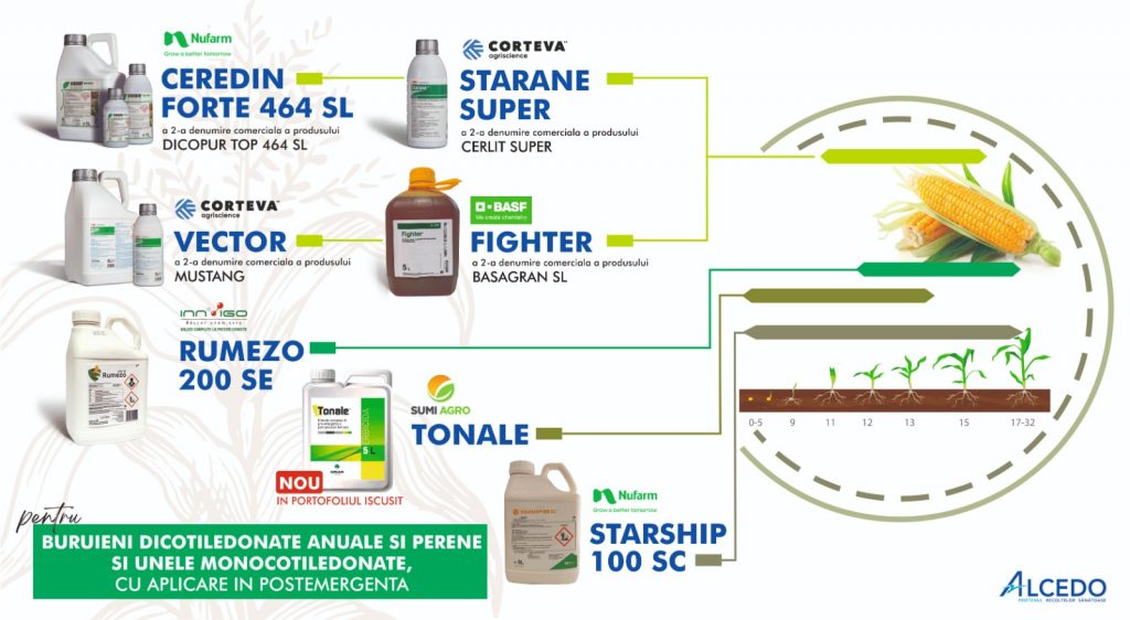 - CEREDIN FORTE 464 SL: 1,0 l/ha, cu aplicare cand porumbul are 4-6 frunze, iar buruienile dicotiledonate sunt in faza de rozeta;