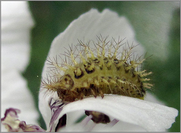 Pupa este galbuie, cu patru excrecente dentiforme pe cap si o lungime de 11,0-12,0 mm.