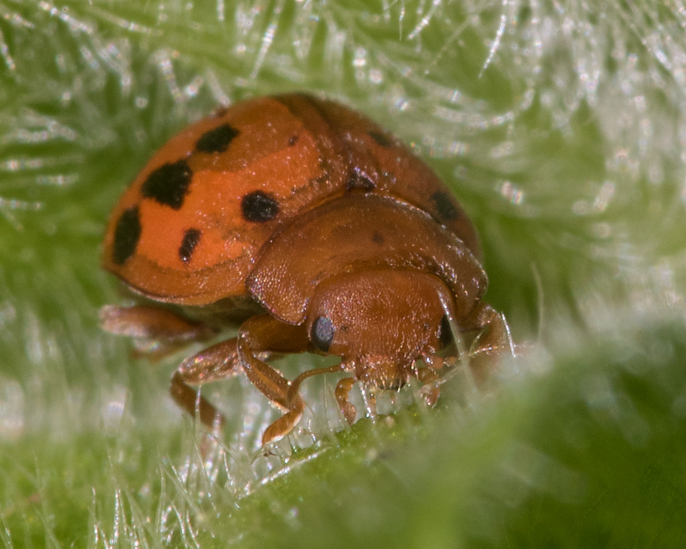 Descriere: adultul are corpul alungit, convex-dorsal, de culoare rosie-caramizie, capul fiind de culoare neagra. Lungimea corpului este de 5,0-6,0 mm. Pe fiecare elitra se gasesc cate trei pete negre. Uneori acestea pot sa conflueze sau sa lipseasca. Antenele sunt filiforme, ingrosate spre varf, de culoare roscata. Oul este alungit, de culoare galbena,avand o lungime de 1,5-1,6 mm. Larva este de culoare galben-cenusie, cu capul mai inchis la culoare. La completa dezvoltare, acestea au o lungime de 8-10 mm. Corpul larvelor este ingustat la extremitati si usor bombat dorsal.