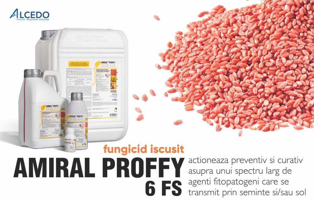 AMIRAL PROFFY 6 FS este un fungicid iscusit, consacrat, fabricat in Romania, ce beneficiaza de o formulare moderna. Este un produs sistemic ce actioneaza preventiv si curativ asupra unui spectru larg de agenti fitopatogeni care se transmit prin seminte si/sau sol. AMIRAL PROFFY 6 FS este omologat la grau, orz, orzoaica, triticale si secara in doza de 0,5 l/t de samanta.