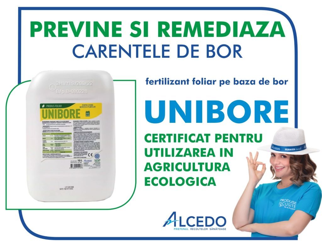 UNIBORE, fertilizant foliar omologat conform normelor europene (EC FERTILIZER), este foarte eficient in prevenirea sau remedierea problemelor de carenta ale culturilor, dar si cu rol in imbunatatirea randamentului polenizarii si a formarii fructelor.