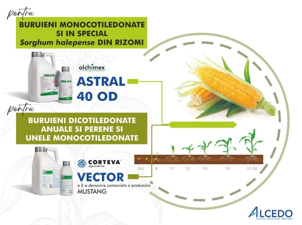 Pentru un spectru complet de combatere a buruienilor la porumb, specialistii ALCEDO recomanda aplicarea erbicidului ASTRAL 40 OD impreuna cu erbicidul VECTOR.