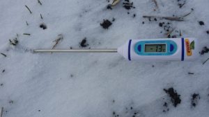 Județul Călărași (08.01.2019): Strat de zapadă de 1cm. Temperaturi de -0,2°C (sub covorul vegetal) de la 1cm până la 10cm adâncime! Condiții termice ale solului perfecte.
