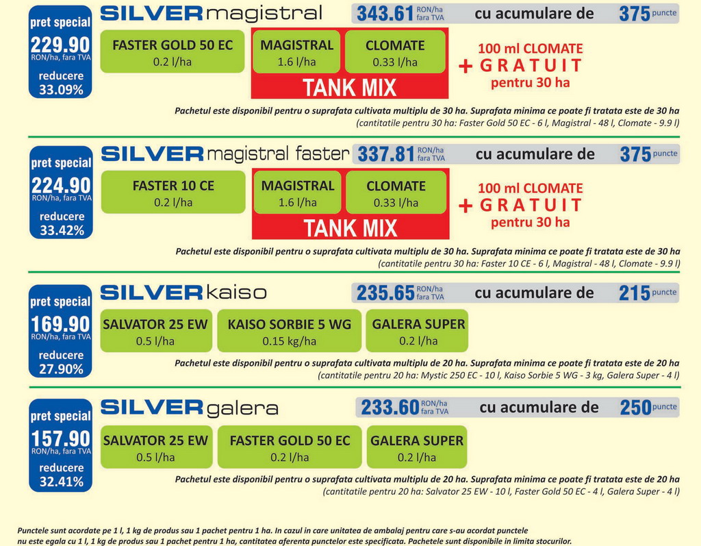 Despre aceste pachete va putem spune ca au in componenta lor cate un fungicid, un insecticid, dar si un erbicid, exceptand pachetele SILVER MAGISTRAL FASTER si SILVER MAGISTRAL care contin cate un insecticid si cate doua erbicide. Pachetele care contin fungicidele SALVATOR sau CARAMBA TURBO, va ajuta sa scapati atat de boli, precum: putregaiul alb, alternarioza, putregaiul uscat, putregaiul cenusiu, fainarea, dar au si efect de regulator de crestere, marind rezistenta plantelor la iernare. Cele care contin insecticidele FASTER GOLD 50 EC, FASTER 10 CE sau KAISO SORBIE 5 WG, va scapa de daunatorii ce apar in toamna, cum ar fi: larva viespei rapitei si puricii de pamant. Cu erbicidele: LEOPARD, RANGO, MAGISTRAL, CLOMATE sau GALERA SUPER prezente in pachete, puteti scapa atat de buruienile graminee, cat si de buruienile cu frunza lata, care isi fac aparitia inca din toamna.