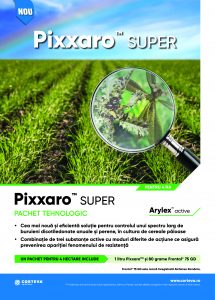 In concluzie, Pixxaro™ Super este inovatia cu cel mai larg spectru de combatere a buruienilor dicotiledonate anuale si perene din cultura de cereale paioase, cu actiune foarte rapida, foarte selectiv pentru cultura de cereale, putandu-se aplica pana la faza de burduf, fara a crea probleme pentru culturile succesive.