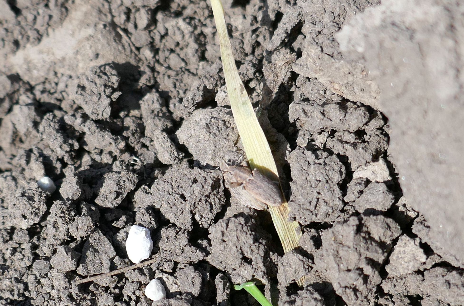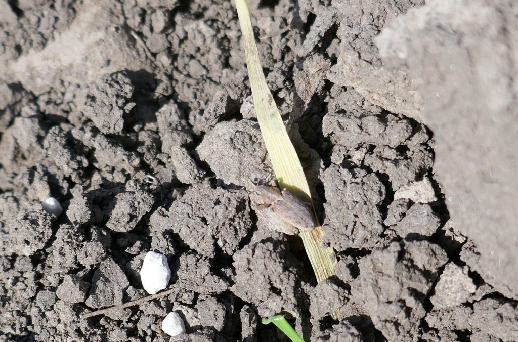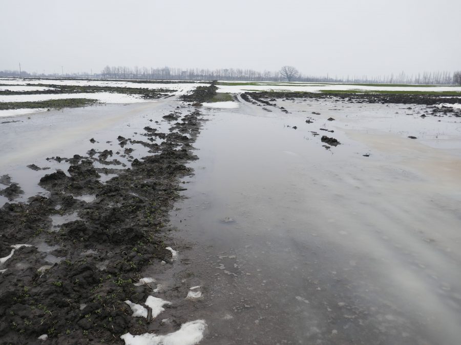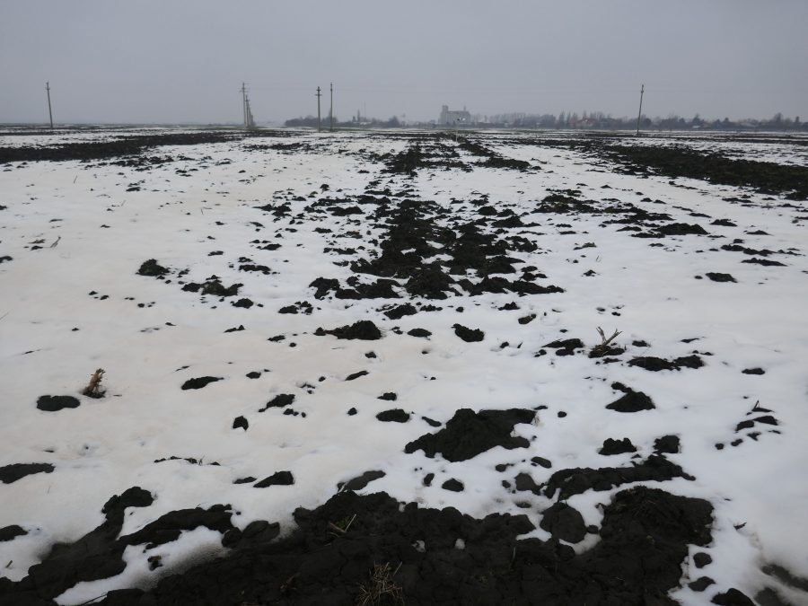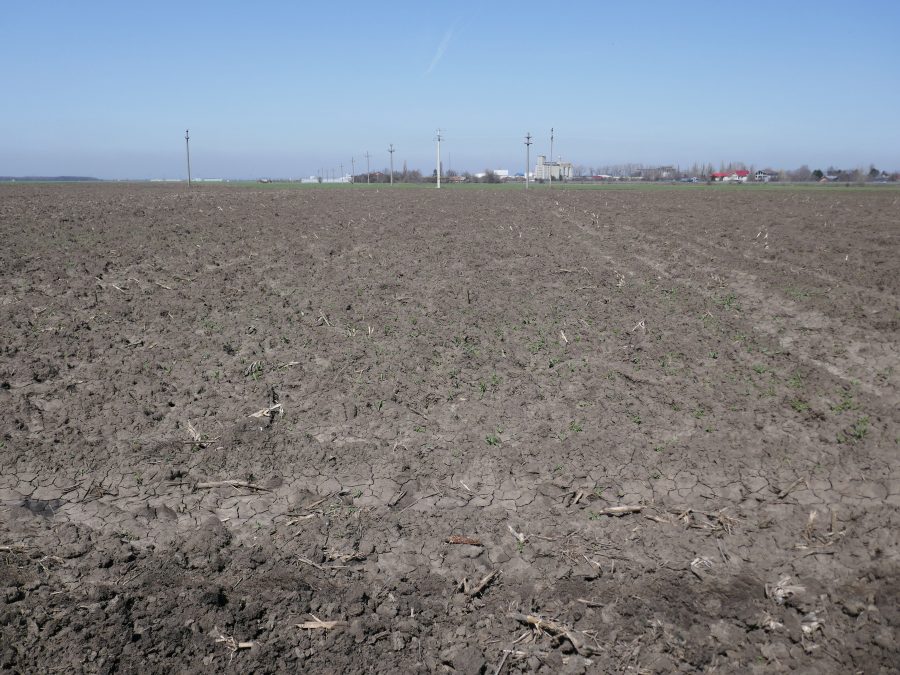 Daca in urma cu cateva saptamani, campul arata ca o orezarie (fig. 1), in prezent (n.r – mijlocul lunii aprilie, data la care a fost redactat articolul), campul era „beton”, din cauza crustei formata la suprafata solului (fig. 2). Ultima zapada cazuta in luna martie a avut si avantaje, prin aportul adus la cresterea rezervei de apa din sol, dar si dezavantaje, ducand la tasarea solului (zapada grea combinata cu lipsa gerului, solul nu a inghetat). Cand vremea s-a incalzit brusc si a inceput sa bata si vantul, solul deja tasat la suprafata, a format crusta.