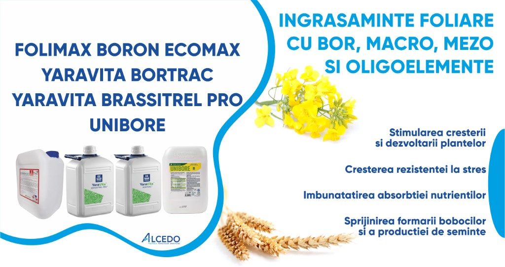 Dintre produsele pe baza de bor din portofoliul ALCEDO va recomandam: FOLIMAX BORON ECOMAX, UNIBORE, YaraVita BORTRAC si YaraVita BRASSITREL PRO.