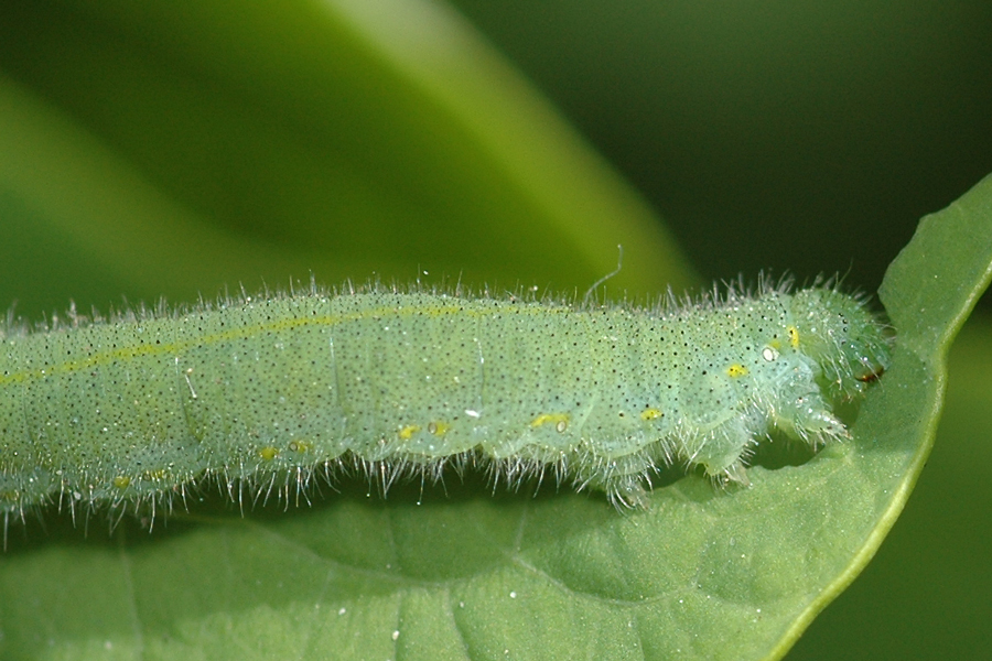 Larva albilitei rapitei este de culoare verde mat, cu corpul prelung si paros, care se confunda cu cea a frunzelor de varza. De obicei, larvele ataca plantele tinere si cu tesuturi suculente, care din cauza foliajului redus sunt rapid defoliate. Precizam ca in camp, acest daunator nu face pagube foarte mari, si asta datorita biologiei insectei, modului ei de hranire si de comportament. Un aspect important este acela ca Pieris rapae depune ponta izolat, de regula cate un singur ou pe frunza, fapt care explica in mare parte numarul redus de larve din culturile de varza. Desi scriam mai sus ca pagubele produse de larvele de Pieris rapae la culturile de varza din camp sunt de mica importanta economica, totusi este de subliniat faptul ca acest daunator este un real pericol pentru rasadurile inainte si dupa plantare.